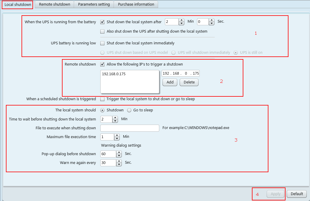 5. 交流電源關(guān)閉后,關(guān)機(jī)命令從192.168.0.175發(fā)送到192.168.0.180和192.168.1.168,然后自動(dòng)關(guān)機(jī),最后UPS關(guān)機(jī)。