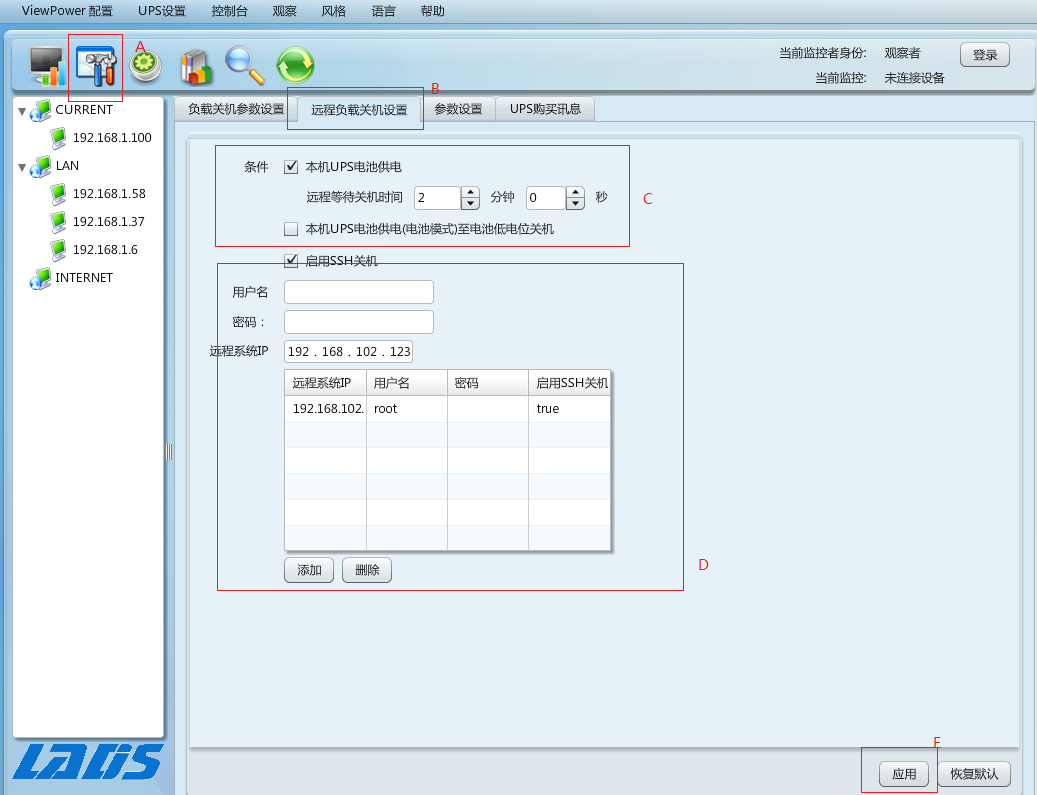 2、如果要在交流故障時關(guān)閉ESXi,請轉(zhuǎn)到UPS設(shè)置 》遠程關(guān)機頁面,請參考A和B部分。然后選擇關(guān)機條件,并設(shè)置關(guān)機時間,參考C部分,并將ESXi服務(wù)器IP地址添加到IP列表,參考D.的部分。最后單擊“應(yīng)用”按鈕保存配置。